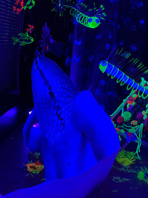 Une plongée sous-marine vers différentes créatures fluorescentes, animales, végétales, minérales dans une vague de lumière noire.